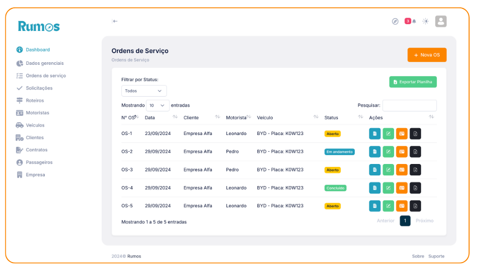 Com o Rumos, você controla frota, insumos e equipes, garante veículos em perfeito estado e proporciona experiências impecáveis aos passageiros.